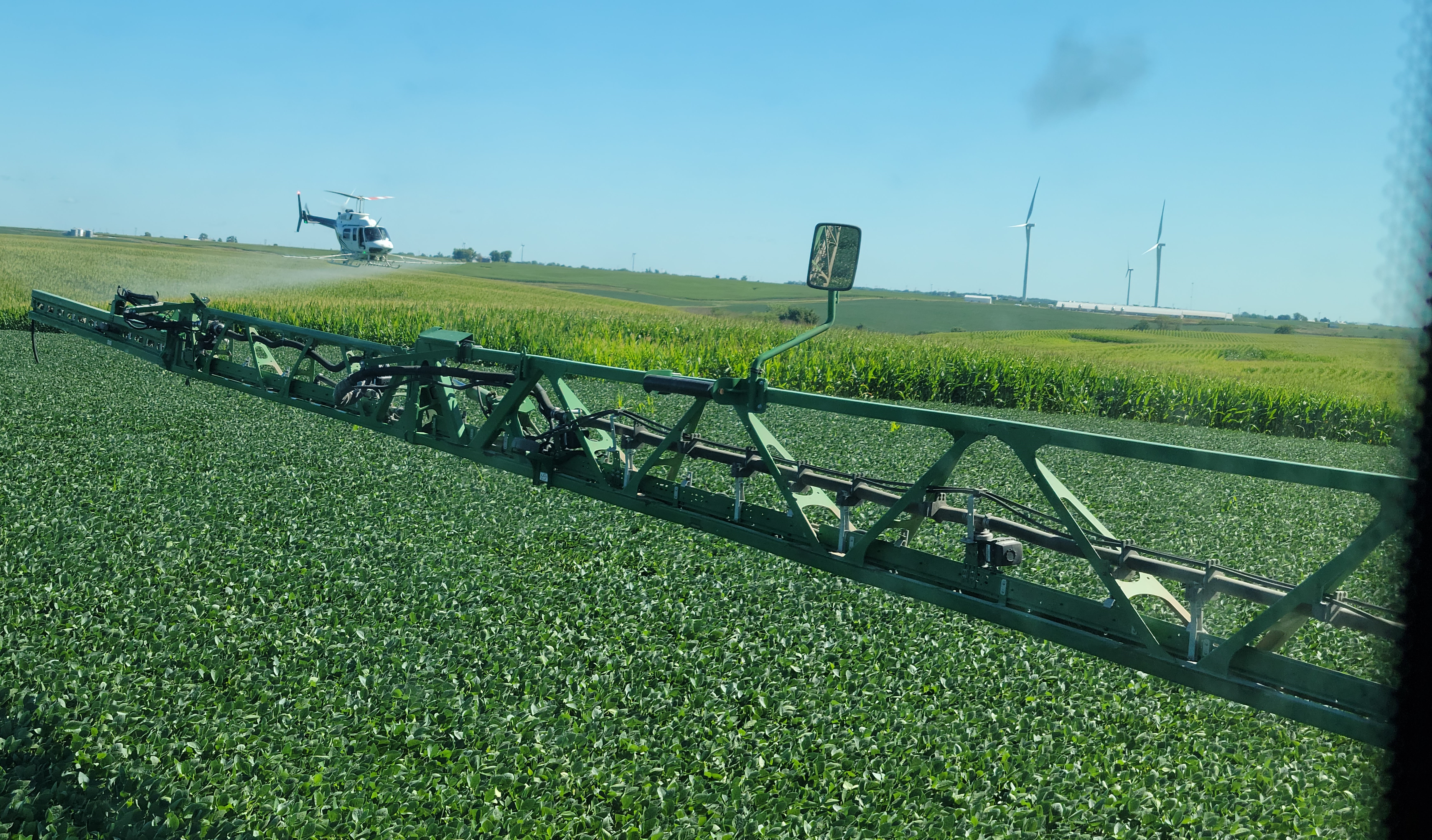 We pretty well wrapped up 3rd pass soybean spraying this past week. On this custom work farm near Deep River I was spraying the beans while the helicopter was right next to me spraying the corn.